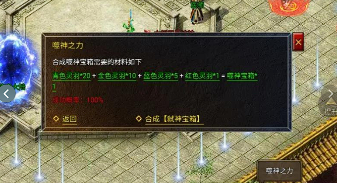 要获得噬神装备,你可以进入蛮荒古城击杀怪物,有一定概率掉落。或者收集红色灵羽的材料,合成一些噬神装备。你还可以利用多件同等级的噬神装备合成更高等级的噬神装备。