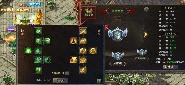 封号天赋技能分为防御和攻击两大类,每类包含8个不同的技能点。技能点的加点有等级要求,需要满足前置技能点的等级条件才能继续加点。不同技能点的加点上限也有所不同,根据位置不同,上限分为202级和400级。