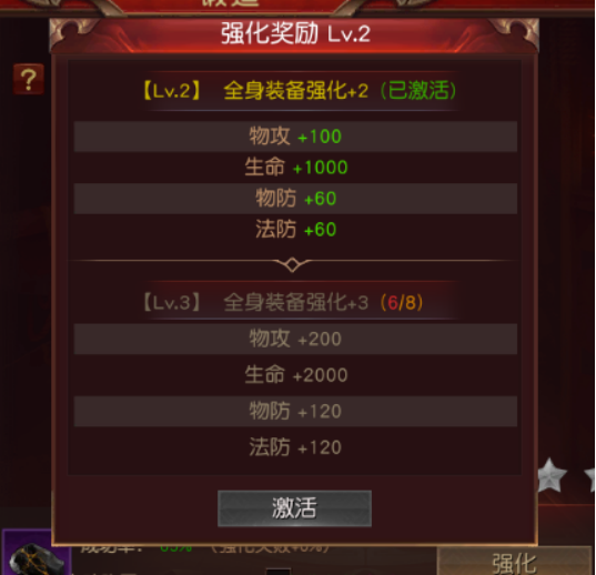 当角色身上所有的装备均强化达到一定等级后,可激活【强化目标】中的阶段性奖励,额外大量提升角色的属性。