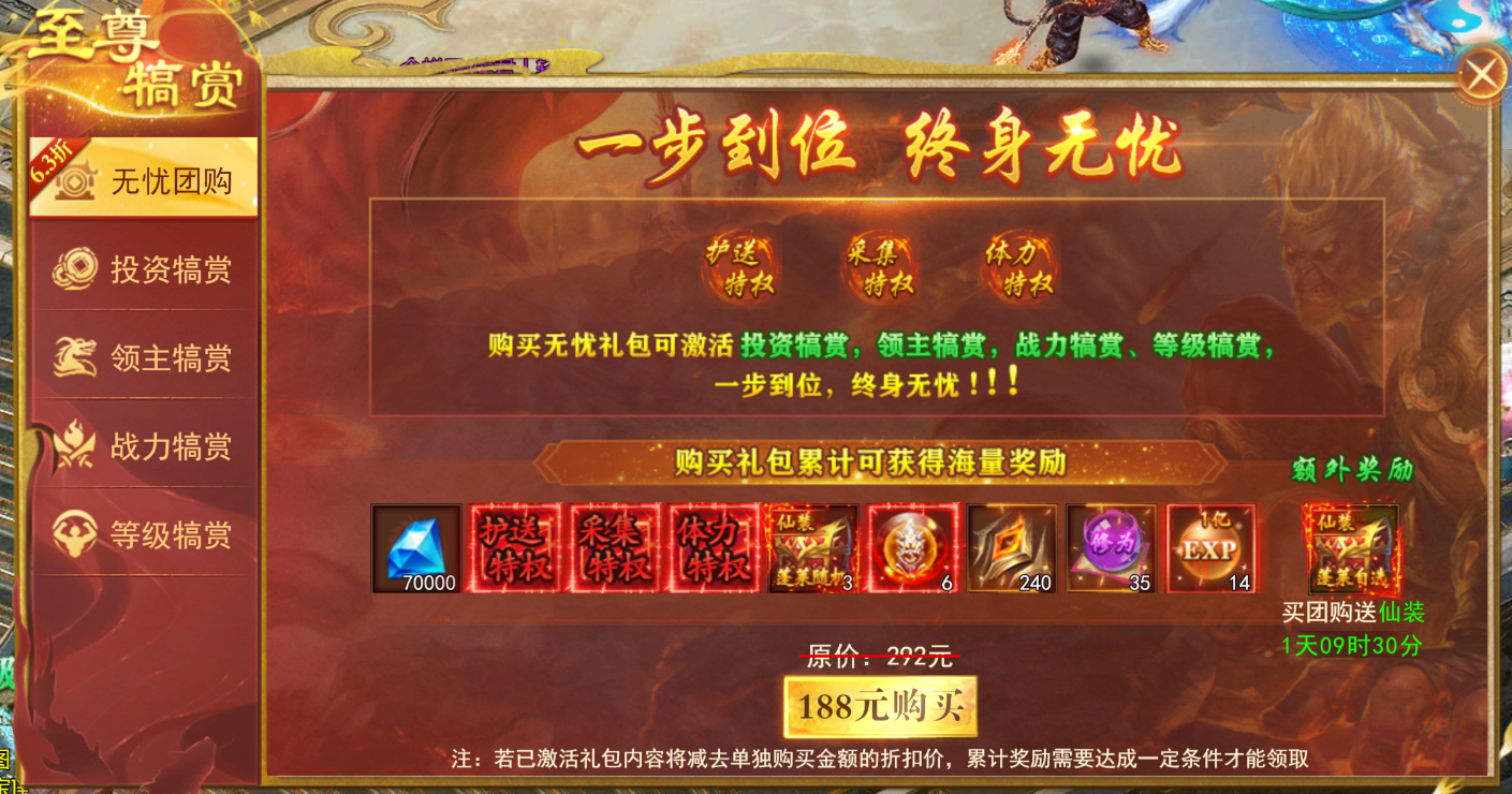 购买无忧礼包可激活投资犒赏、领主犒赏、战力犒赏、等级犒赏,一步到位,终身无忧,购买后可永久开启直到领完奖励。