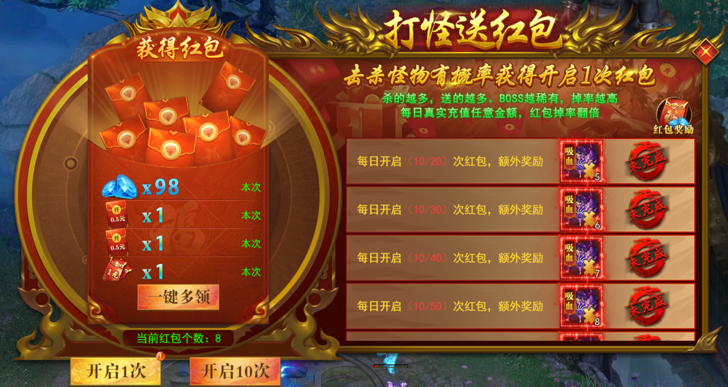 击杀怪物有概率获得红包开启次数,杀的越多送的越多,boss越稀有,掉率越高;每日真实充值任意金额,红包掉率翻倍,还可多领一次。