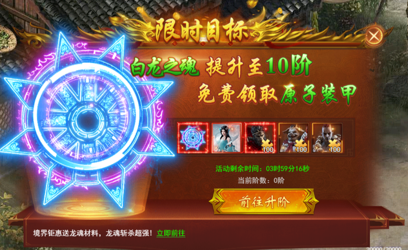 在线时间满足即可领取白龙魂,提升龙魂等级可领取达标奖励,数量有限先到先得。终极奖励-吸血神器-悟空神棒。