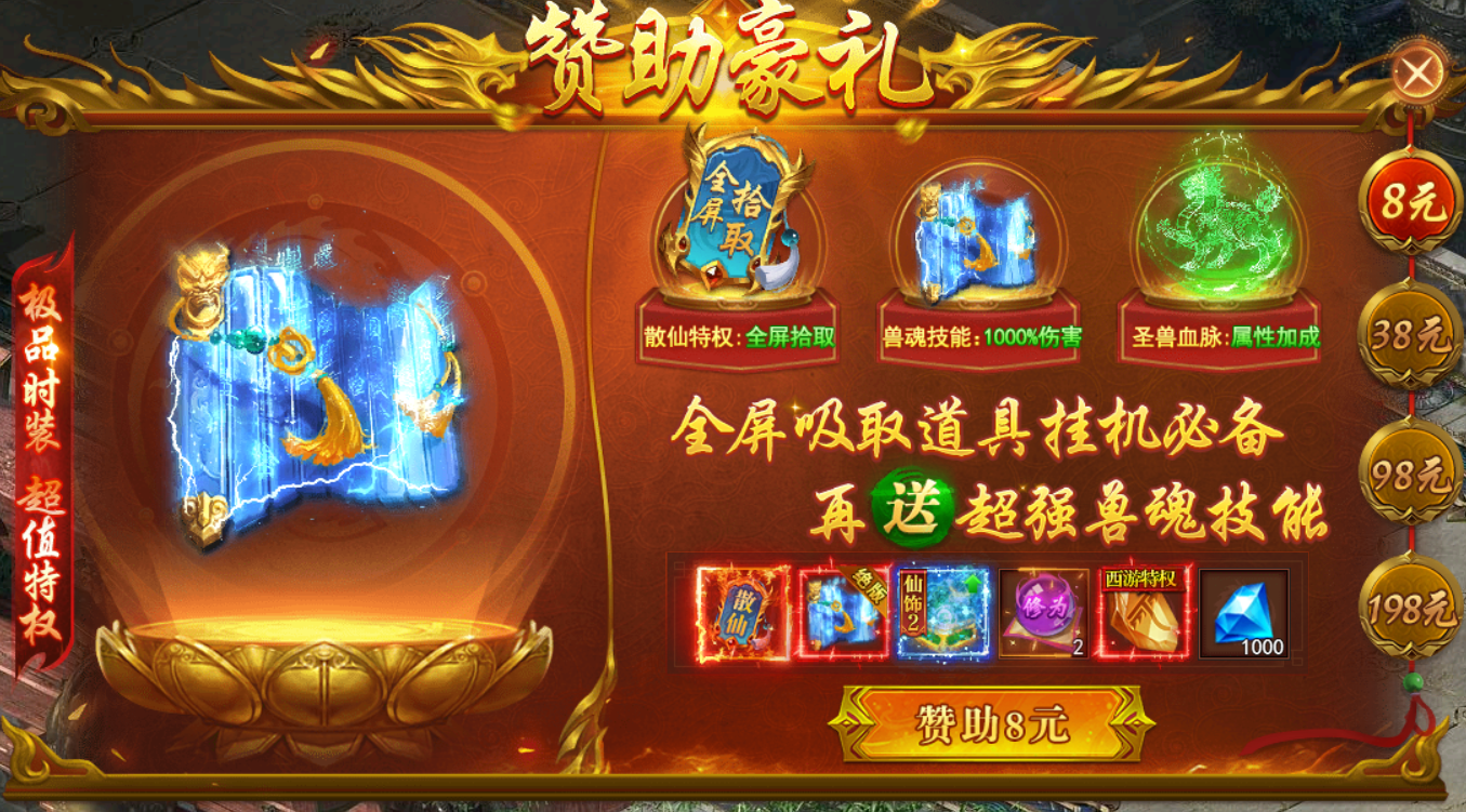 送骑战技能、西游特权、绝版称号、绝版时装等超值奖励,终生仅此一次
