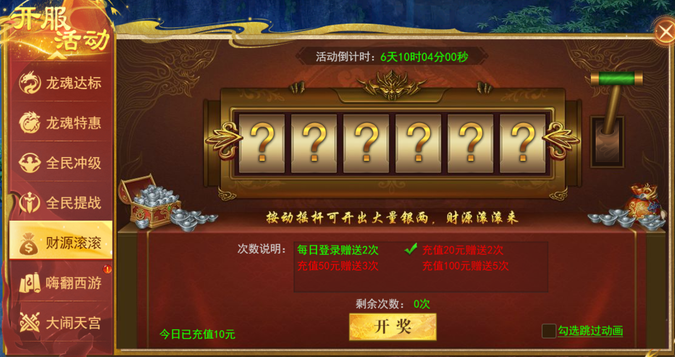每日登陆、充值赠送摇杆次数,按动摇杆可开出大量银两,财源滚滚来。