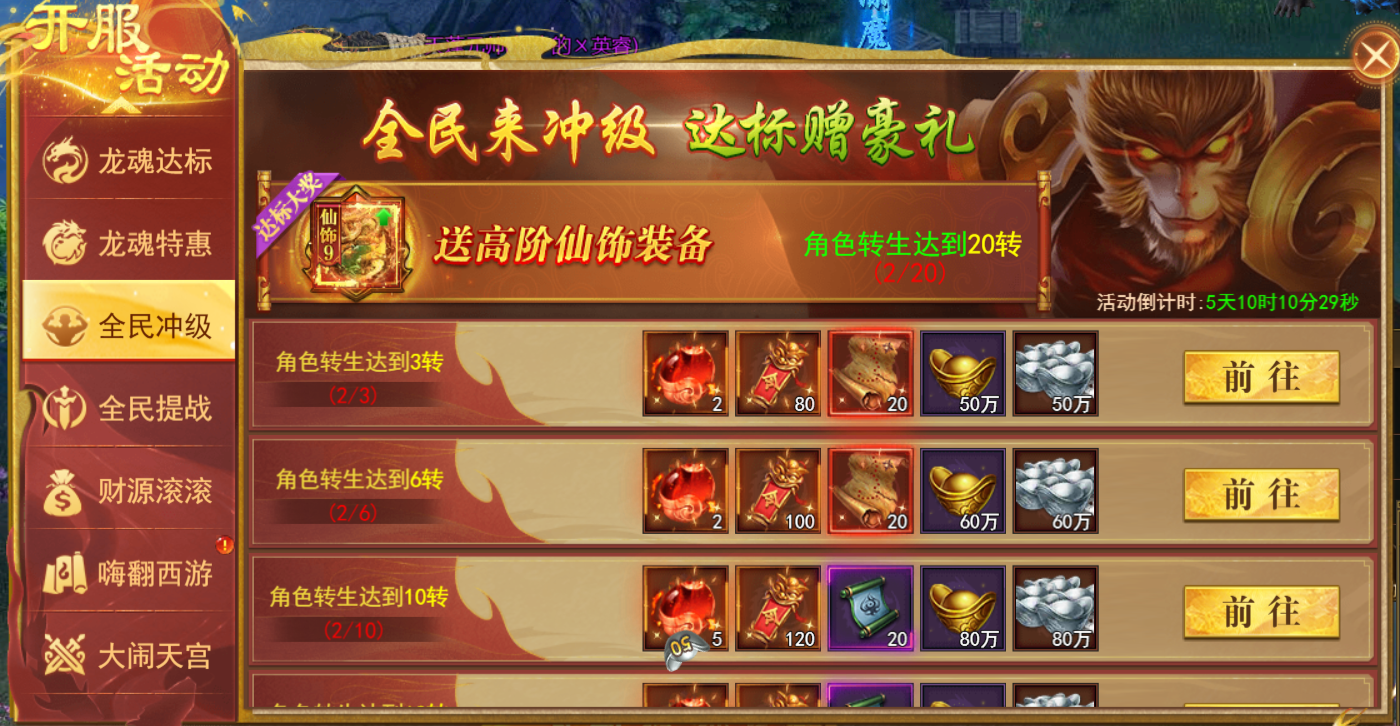 活动期间等级或转生达到对应要求级了领取冲级奖励一份,全民来冲级,达标赠豪礼。