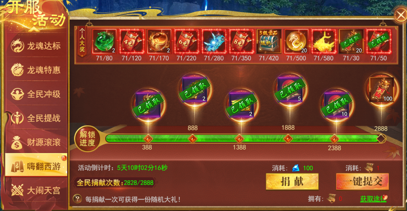 提交通过文牒助力西游,可获得个人奖励和全服奖励,每提交一次可获得一份随机大礼。可直接钻石捐献,也可通过开服活动获得通过文牒。