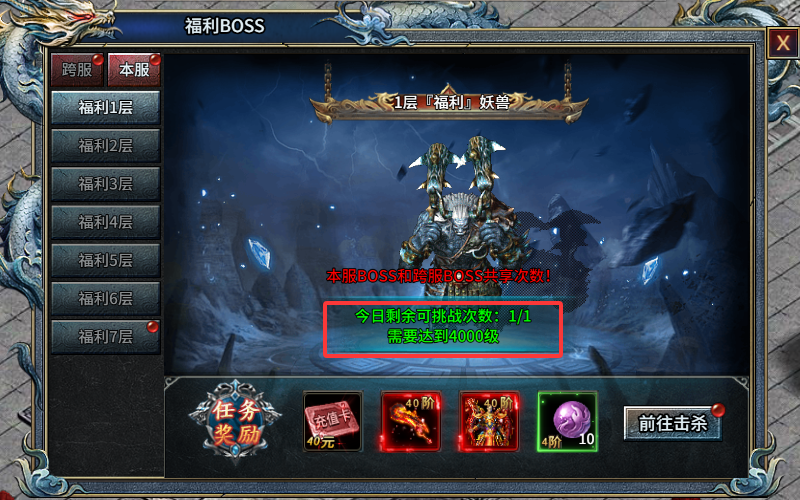本服福利boss奖励相对会少些,挑战击杀上一层福利boss并且达到对应层数要求的等级后,才能进入下一层